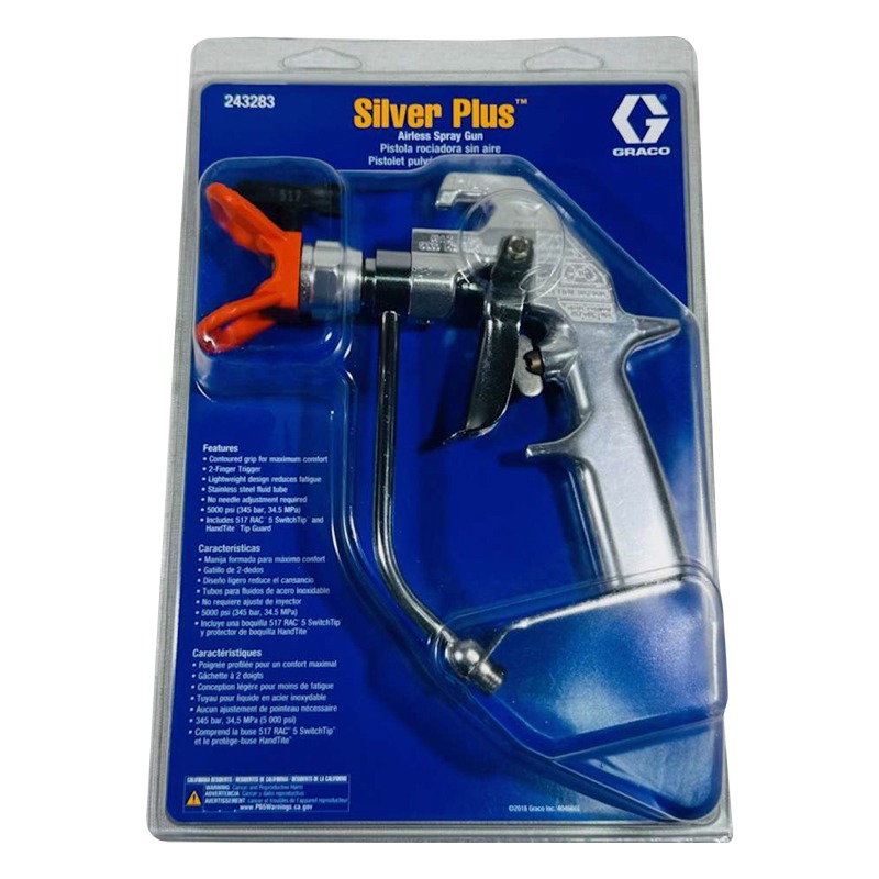 The GRACO Silver Plus Spray Gun (Part Number: 243283) is a high-performance airless spray gun designed for precision and durability in demanding painting applications. Featuring a two-finger trigger for improved comfort and control, this spray gun comes equipped with the RAC 517 (Reverse-A-Clean) tip, allowing for efficient spray patterns and easy tip cleaning to reduce clogs.