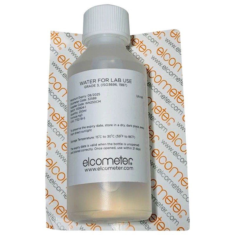 The Elcometer Pure Distilled Water is a high-quality, laboratory-grade distilled water, essential for a wide range of inspection and maintenance tasks. Packaged in a convenient 250ml (8.5 fl oz) bottle, this distilled water is ideal for cleaning sensitive equipment, calibrating inspection tools, and preparing surfaces for painting or coating applications.
